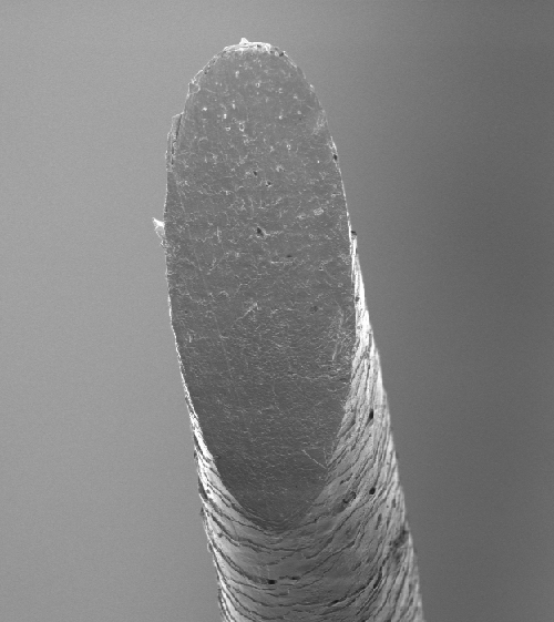 Der Trick dabei ist gar nicht so einfach zu erlernen und deswegen darf sich auch nicht jeder "Calligraphy zertifiziert" nennen. Die spezielle Form des Schneidewerkzeugs sorgt nämlich dafür, dass die Haare in einem Winkel zwischen 21 und 23 Grad schräg abgeschnitten werden. Dabei kommt das gleiche Prinzip wie bei Blumen zum Einsatz. Die Haare werden wie der Stil einer Rose verletzungsfrei abgeschnitten. Eine Schere quetscht das Haar eher ab. Die Größere Schnittfläche lässt das Haar optisch voluminöser wirken, elastischer werden und damit auch glanzfähiger. Das sieht man freilich nur unter dem Mikroskop - aber das ganz deutlich!